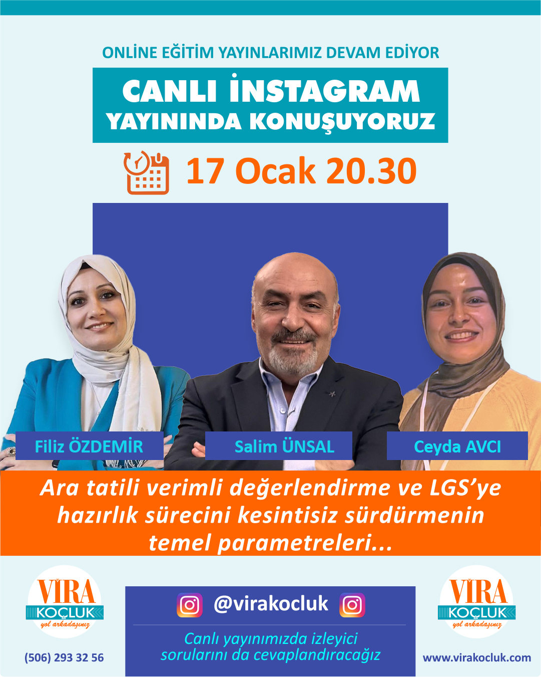 17 Ocak 2026 Cumartesi günü saat 20.30'da İnstagram profilimizde ilk canlı yayınımızı yaptık. Bu yayında hem ara tatil sürecini verimli değerlendirme hem de LGS hazırlık sürecini kesintisiz sürdürmenin ipuçlarını paylaştık. Matematik Eğitimcisi ve Yazarı Hasan Aydemir hoca da programımızın sürpriz konuğuydu.